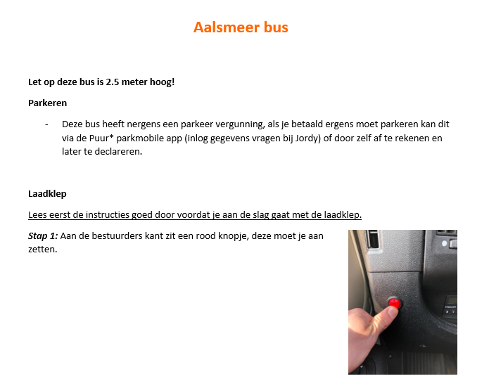 - Behandel de Puur* bus net zoals een huur auto. Loop een rondje om de auto zodat je weet wat voor schade er al op de bus zit.
