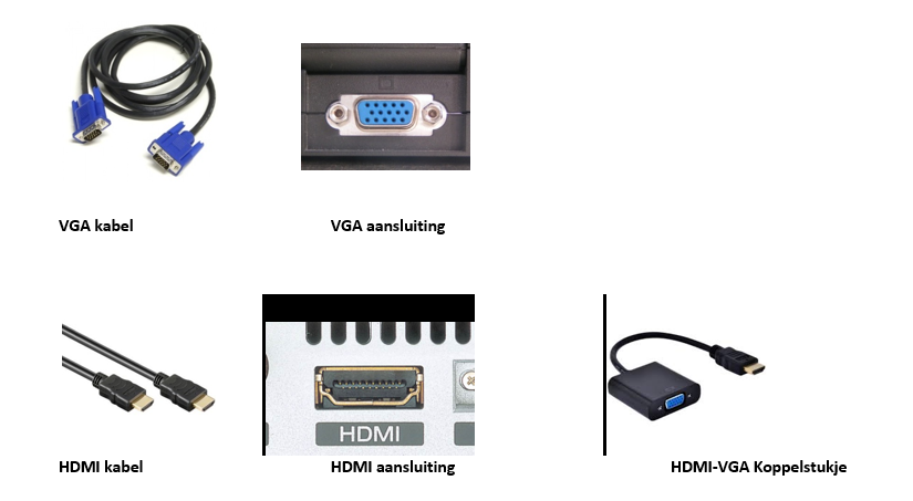 - Controleer op de laptop en op de beamer of er een VGA-aansluiting of een HDMI aansluiting is.