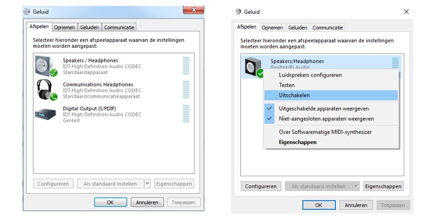 - Kies de optie afspeelapparaten en vervolgens krijg je het onderstaande beeld. Kies hier het juiste afspeelsysteem en je geluid moet het doen. (Lukt dit niet, probeer dan de overige opties uit te zetten doormiddel van te klikken met je rechtermuis knop)