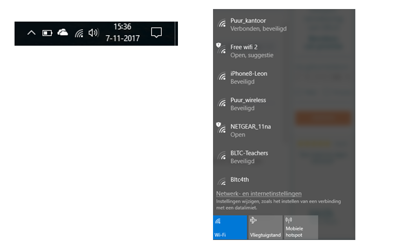 - Als de laptop niet is aangesloten op de WiFi klik dan rechtsonder op het WiFi tekentje. Kies het wifi netwerk van de locatie waar je zit en vraag daar om de WiFi code.