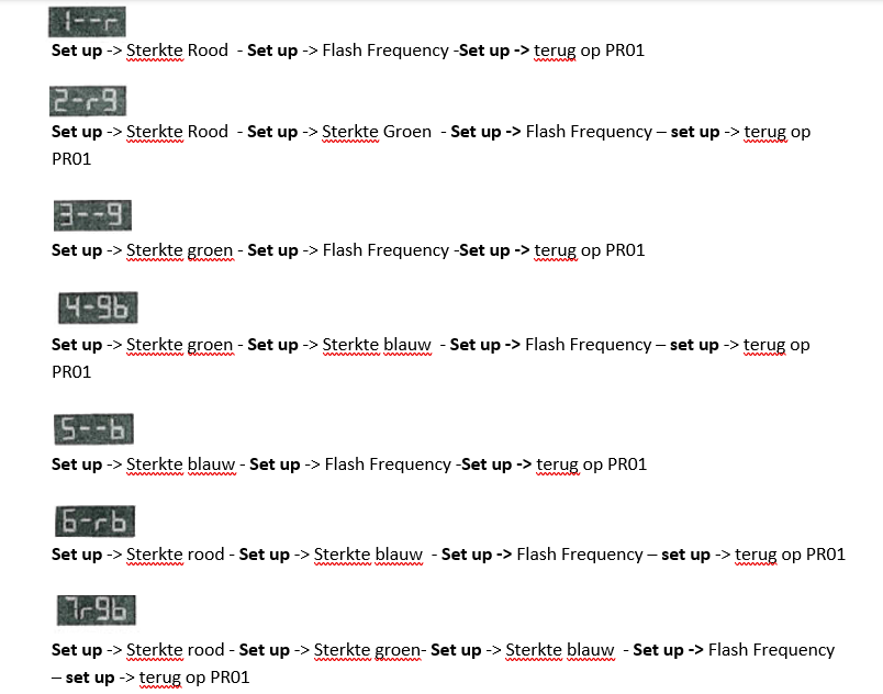 Set up -> Program running speed (SP1-SP99) – Set up -> Flash frequency (F500-F599) – Set up -> terug naar PR02-10
