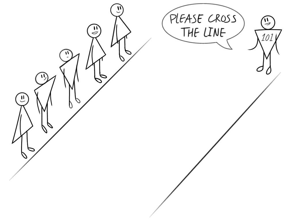 - Deelnemers die zichzelf in de beschreven situatie herkennen, stappen over de denkbeeldige streep naar de andere kant.